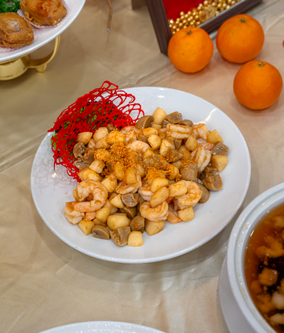 A lighter, vibrant option where the natural sweetness of prawns – symbolising laughter – shines alongside the crunch of fresh chestnuts.