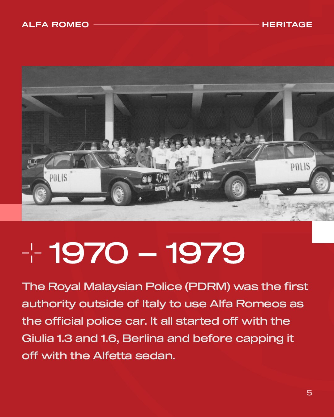 The story goes further: in that same year, the locally-assembled Berlinas & Alfettas became the first ever Alfa Romeos to be built away from their Italian home while establishing our homegrown car manufacturing capabilities beyond a doubt. With Alfas then also favoured by the Italian carabinieri for their dynamically agile performance, our Royal Malaysian Police (PDRM) then made further history by being the first authority outside Italy to use them as official police cars.