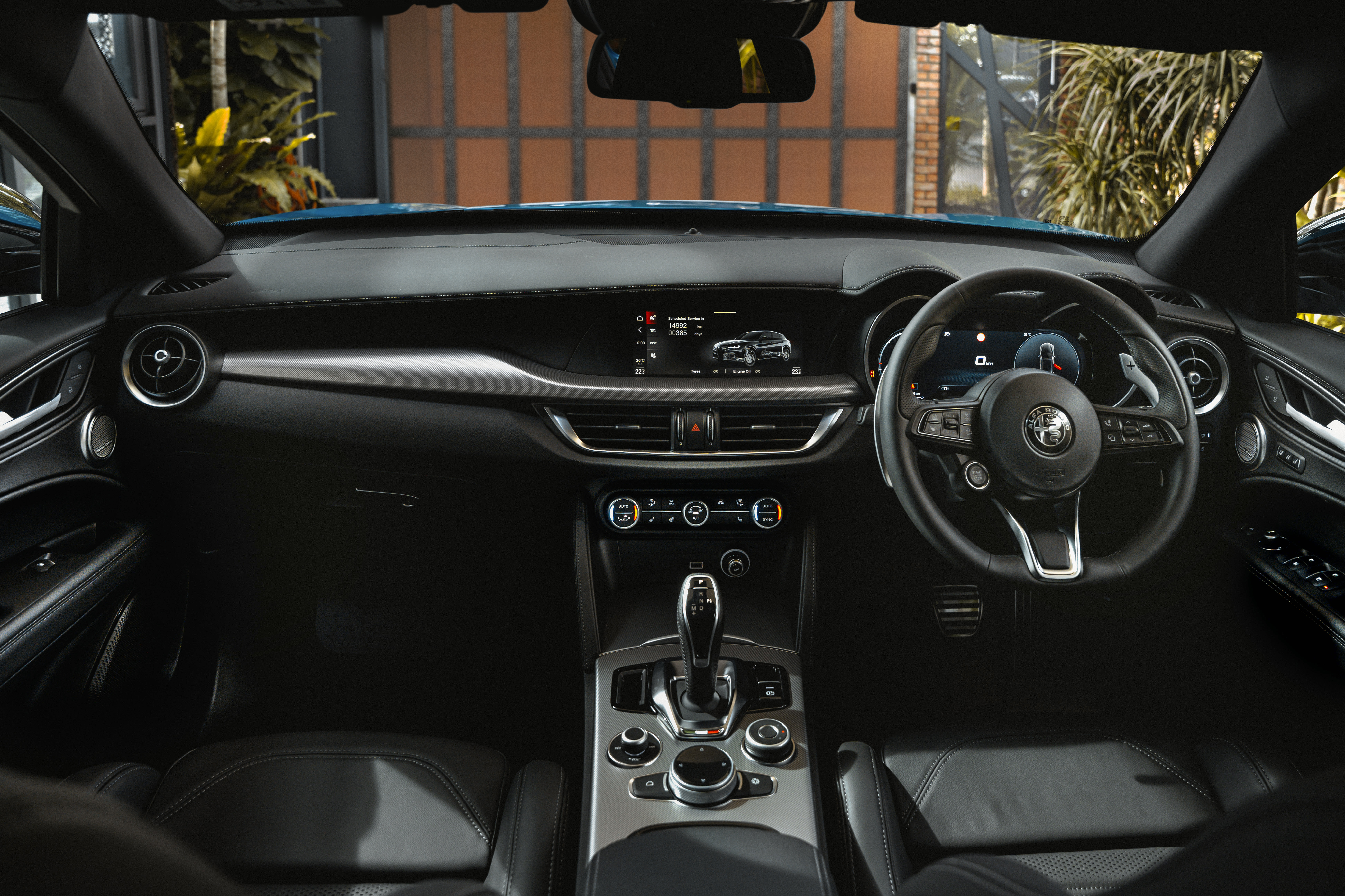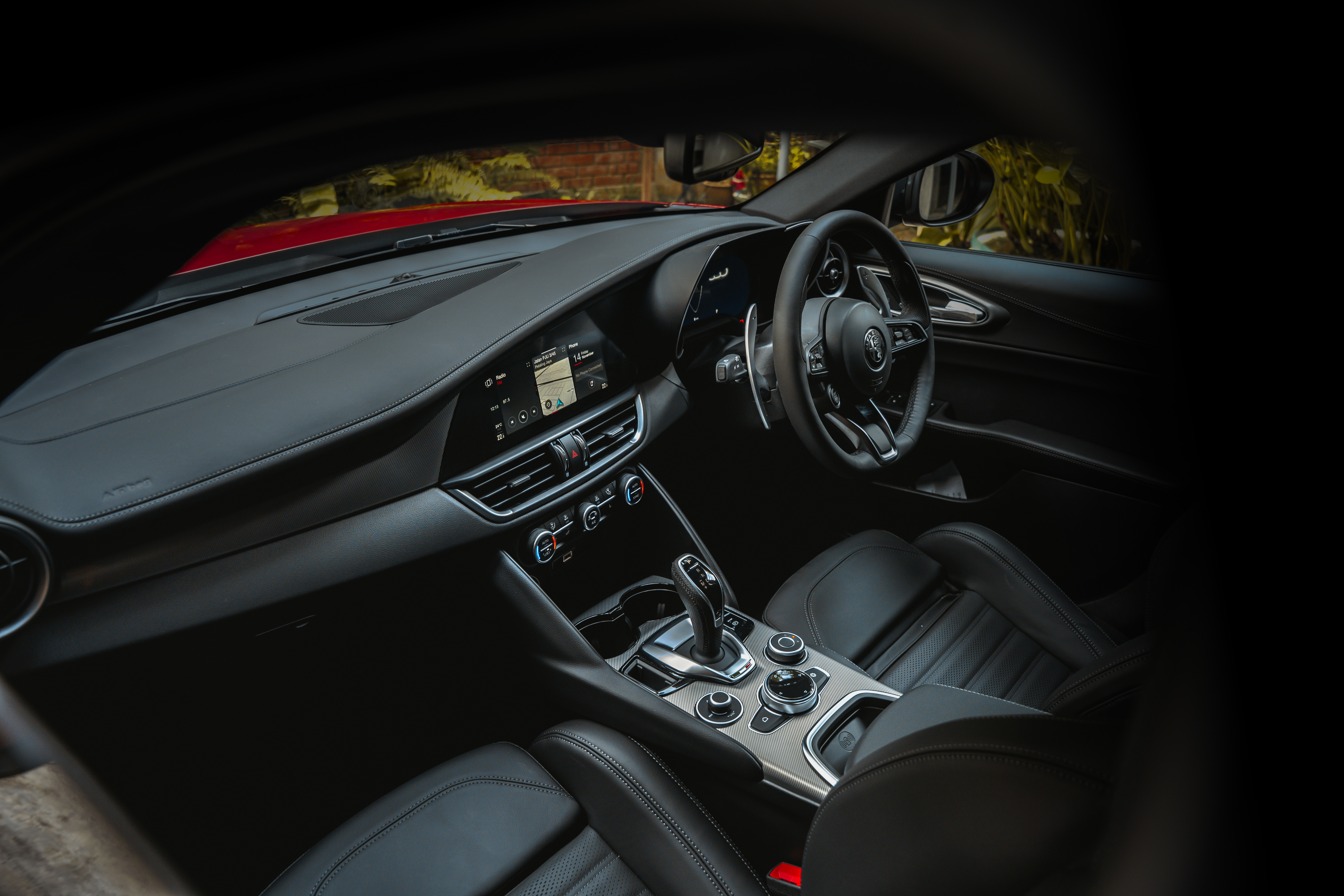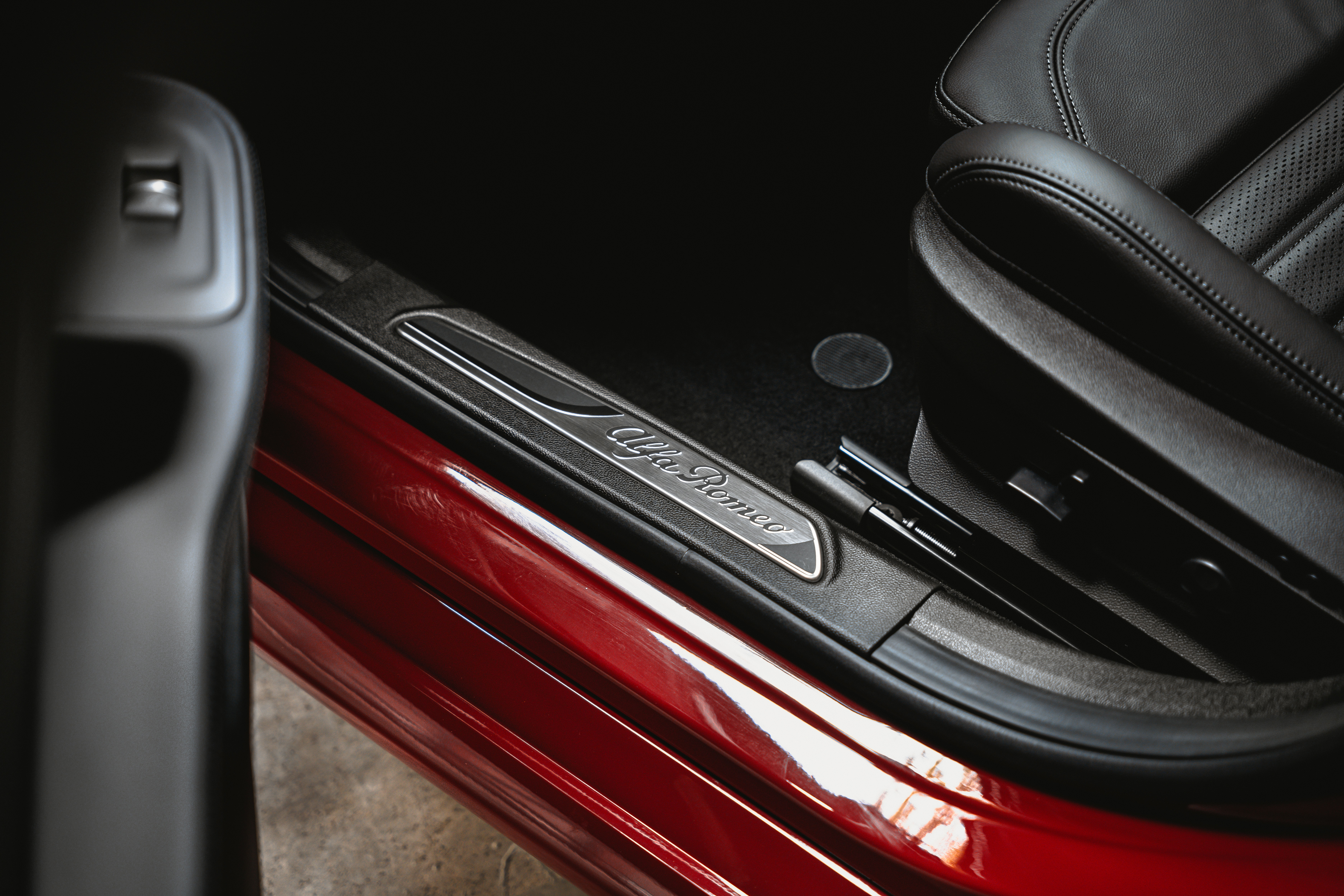 Control inputs are directly translated into quick-footed motion by the 11.8:1 quick-steering ratio, a lightweight carbon fibre driveshaft & Q2 mechanical LSD, creating a driving experience that feels confidently alive with all of the agility which has long defined the greatest drivers’ Alfa Romeos. Fine Italian craftsmanship carries through into the Veloce’s cabin too, with the updated 12.3-inch digital TFT cluster touting classic-style Alfa Romeo dials to compliment the dashboard’s clean minimalism; complimented by the 3-spoke leather-wrapped steering wheel, sports seats and aluminium accents.