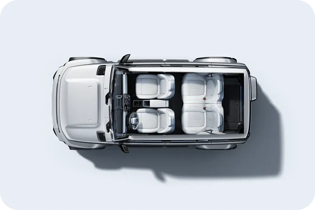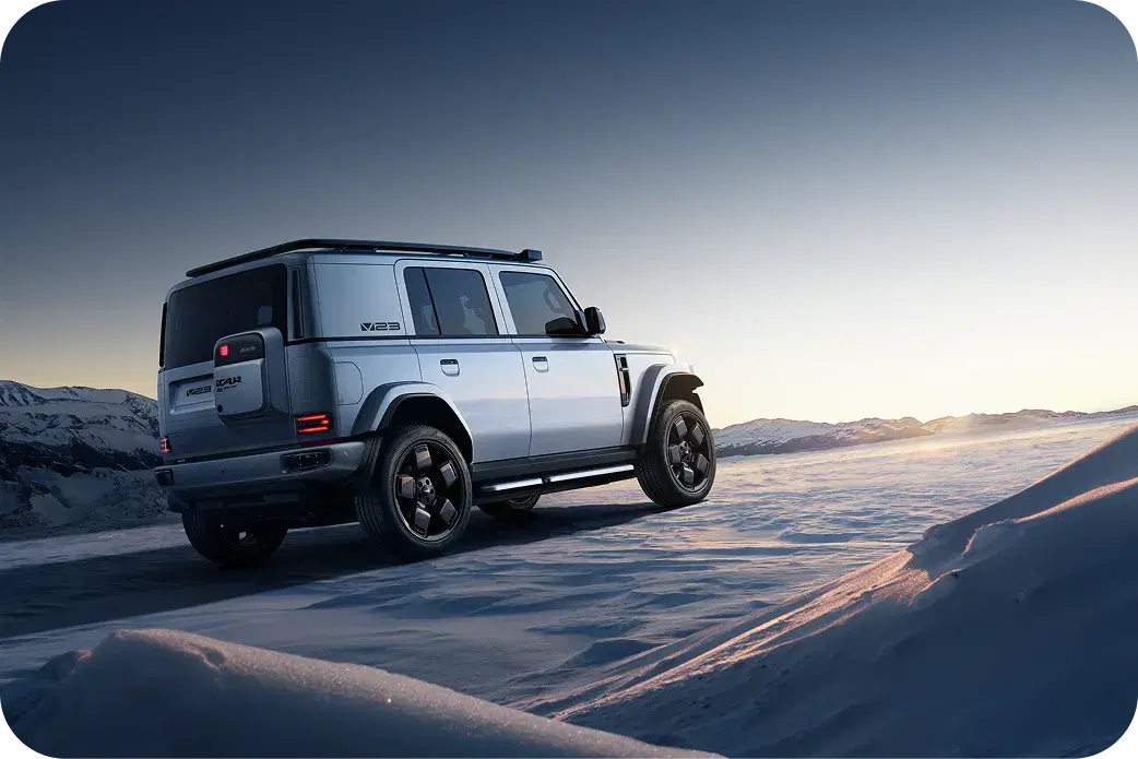 Paying homage to classic 4×4 icons including the Jeep Wrangler & early Land Rover Defender, yet having expressively reimagined those exterior cues for the electric age, the V23 measures in at 4,220 mm long, 1,915 mm wide & 1,845 mm tall. Combined with its long wheelbase of 2,735 mm, this strikes an ideal balance between an assertively planted exterior stance and a comfortably practical interior cabin for occupants. Function truly informs form here with short front & rear overhangs, enhancing the V23’s prodigious off-roading capabilities with a 42-degree approach angle, 41-degree departure angle & the ability to tackle slopes of up to 40% gradient.