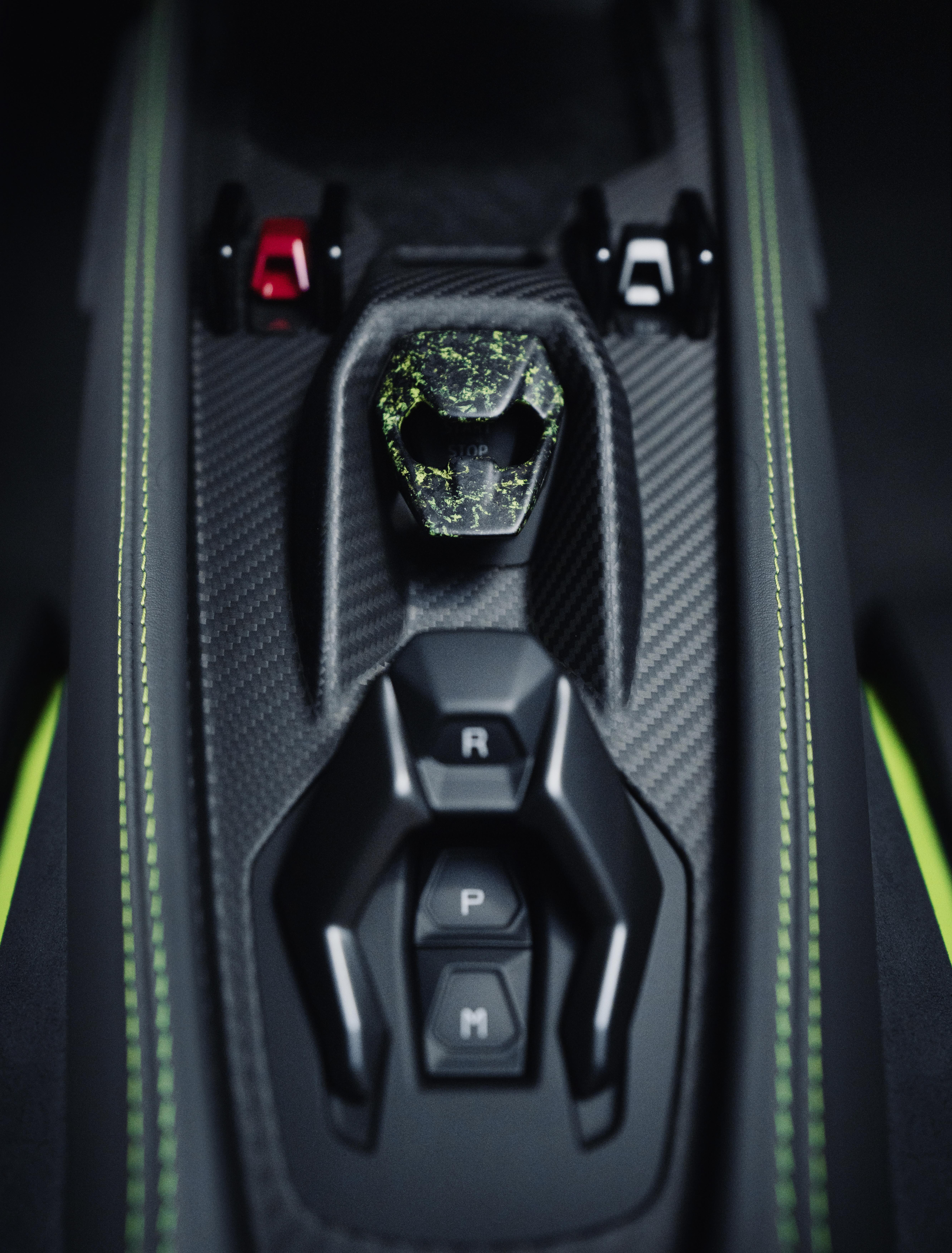 More than 320 additional hours of hand painting were dedicated to achieve its strikingly innovative exterior crystal paint effect, combining Nero Nemesis, Verde Shock and Grigio Maat tones into an intricately artistic pattern that enhances the supercar’s highly aerodynamic visual character. The resulting aesthetic effect also underscores the “Alleggerita” package’s lightweight engineering, with extensive carbon fiber elements incorporated for more track driving focused customers.
