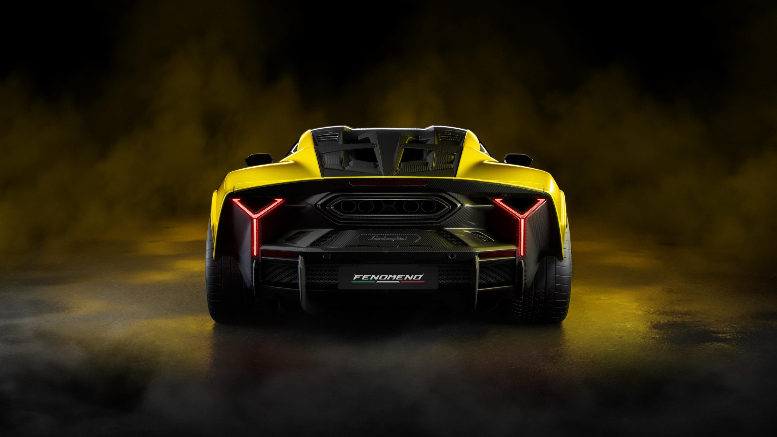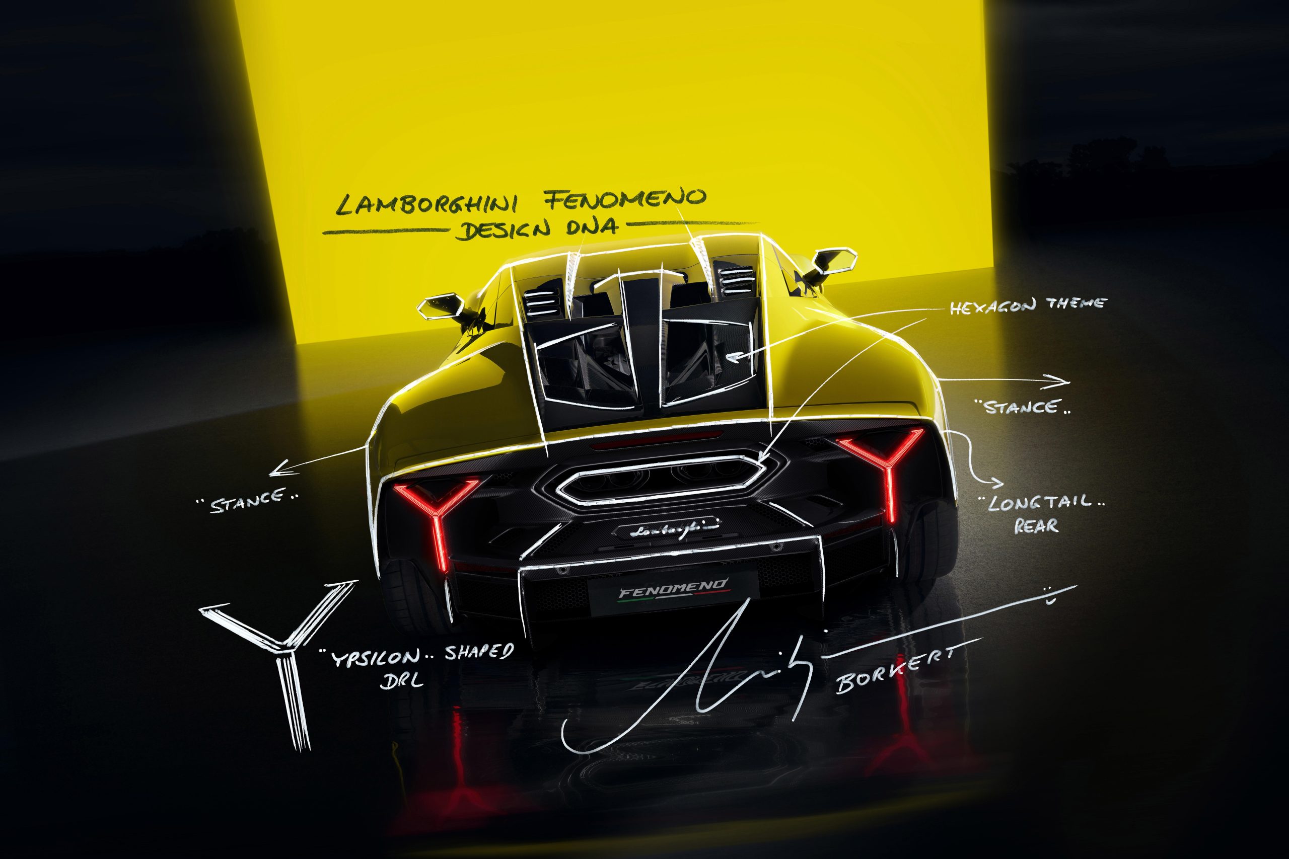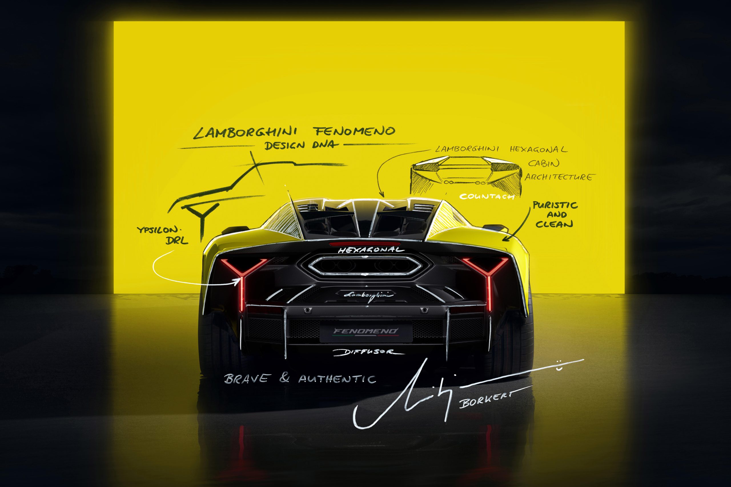 Viewed from the rear, a single seamless line connects its wing and wheel arches to clearly delineate a visual boundary. Meanwhile, vertical Y-shaped tail lights futuristically reinterpret this iconic Lamborghini visual element, while joining the rear diffuser’s carbon fiber elements to frame the exhaust terminal’s visually dominant hexagonal form.