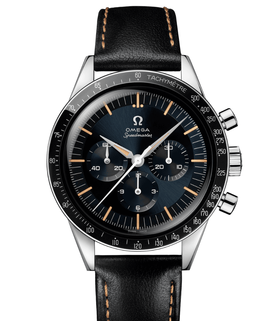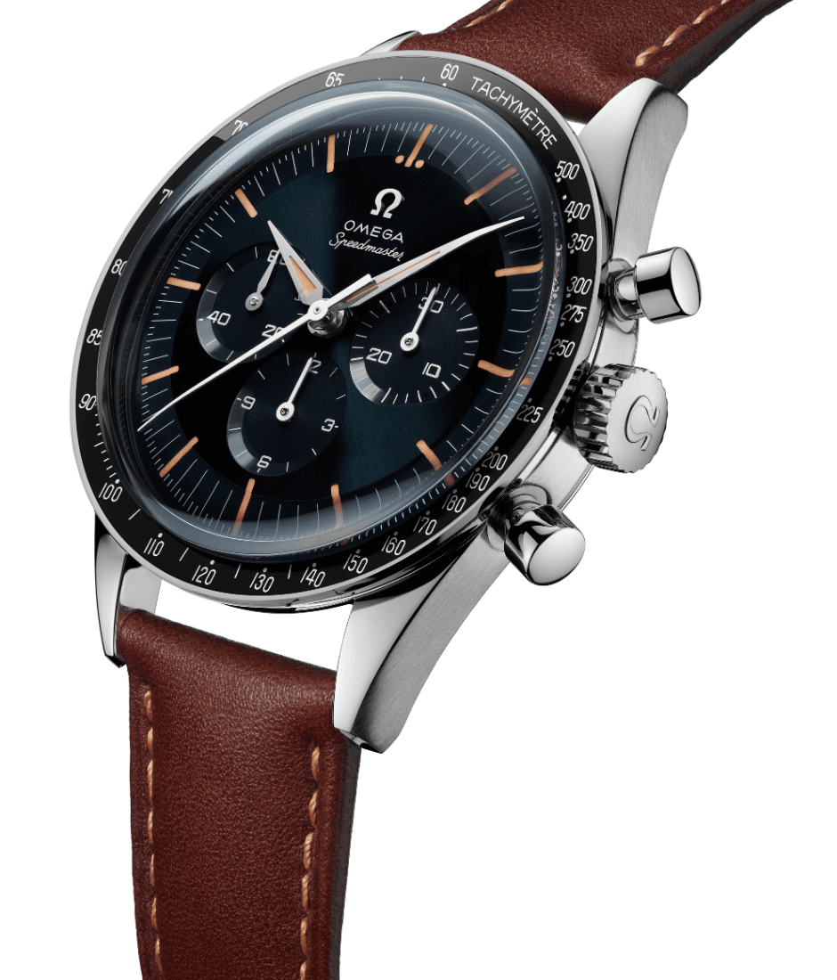 The new models maintain the same style as the 1959 watch, featuring a symmetrical 39.70 mm polished-brushed stainless steel case. The bezel ring is dark and made of black aluminium, the colour giving the watch a sleek visual. On it is the Speedmaster’s essential tachymetre scale including the ‘Dot Over Ninety’ that can also be found in the earliest Speedmaster models.