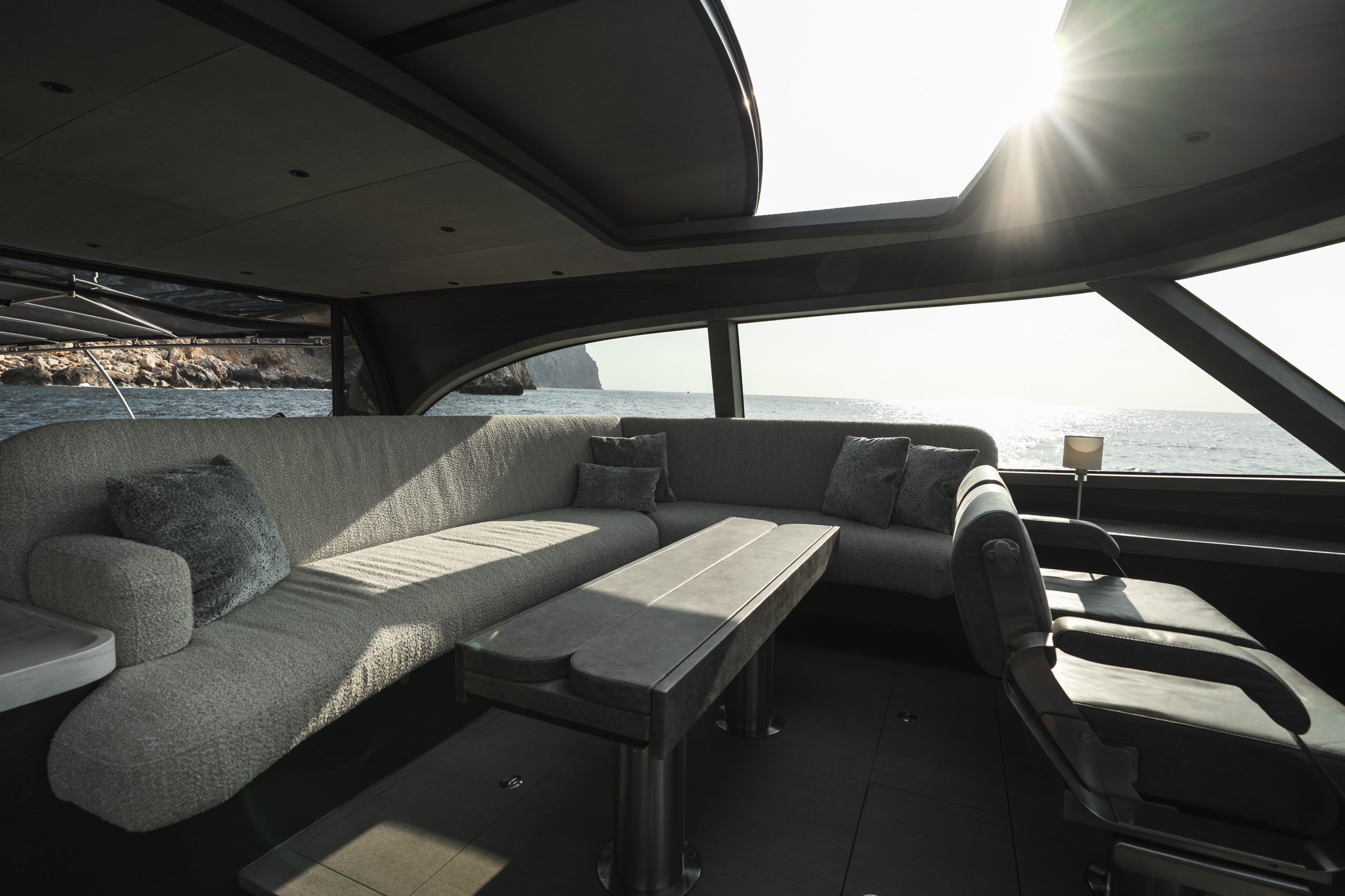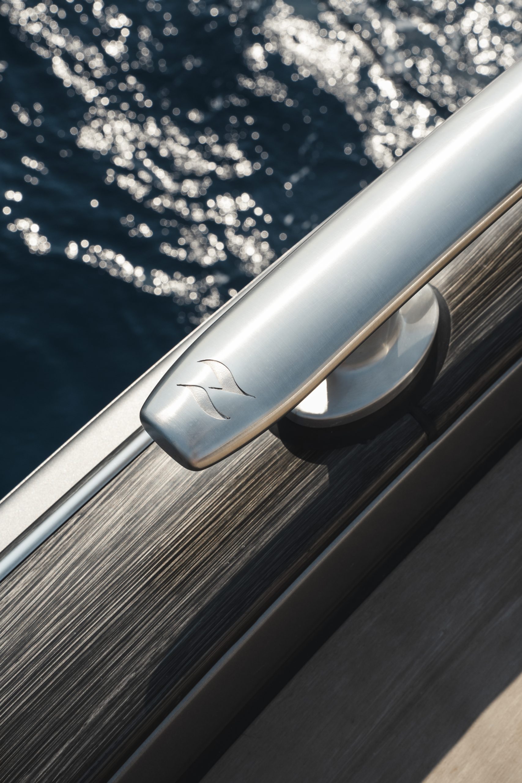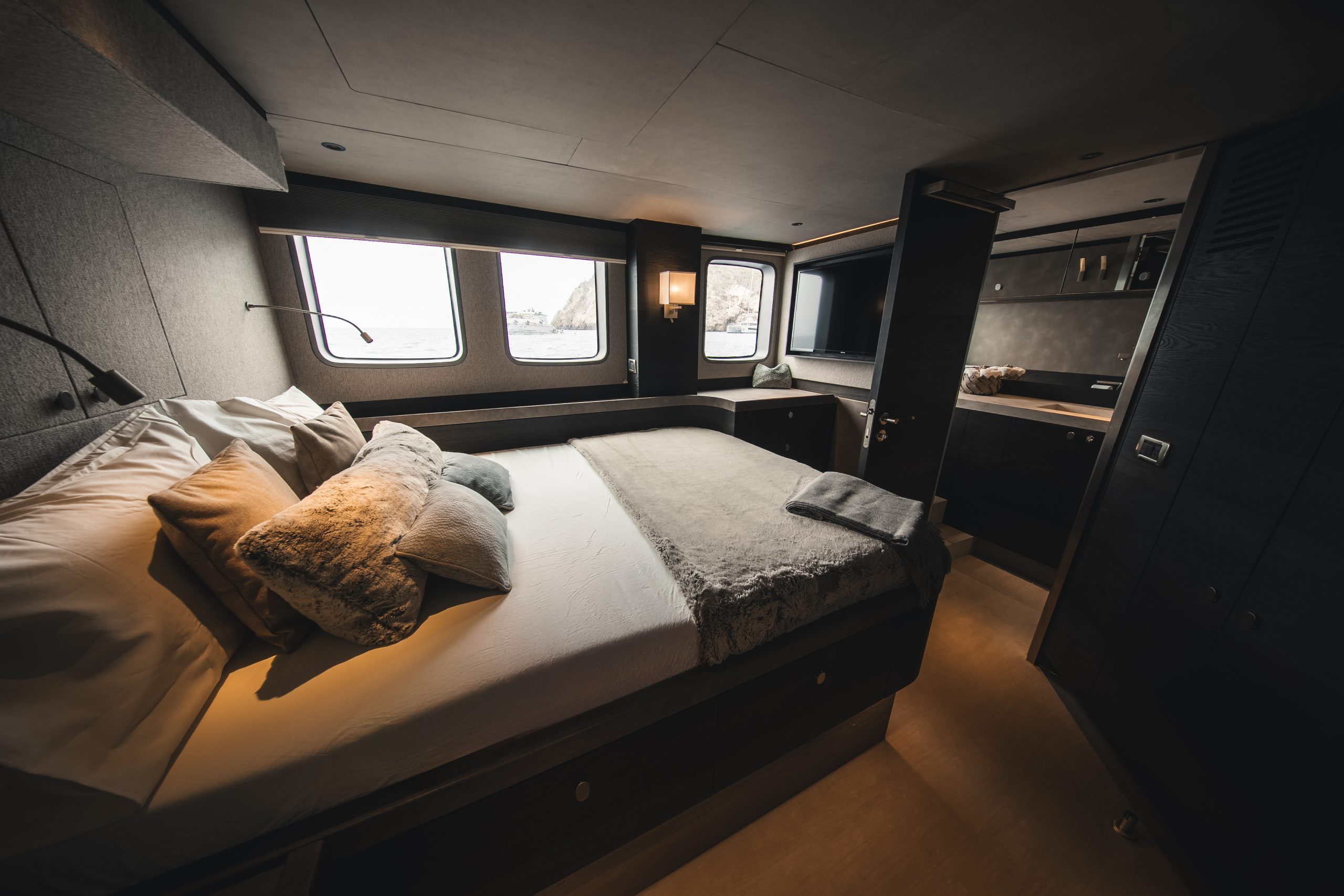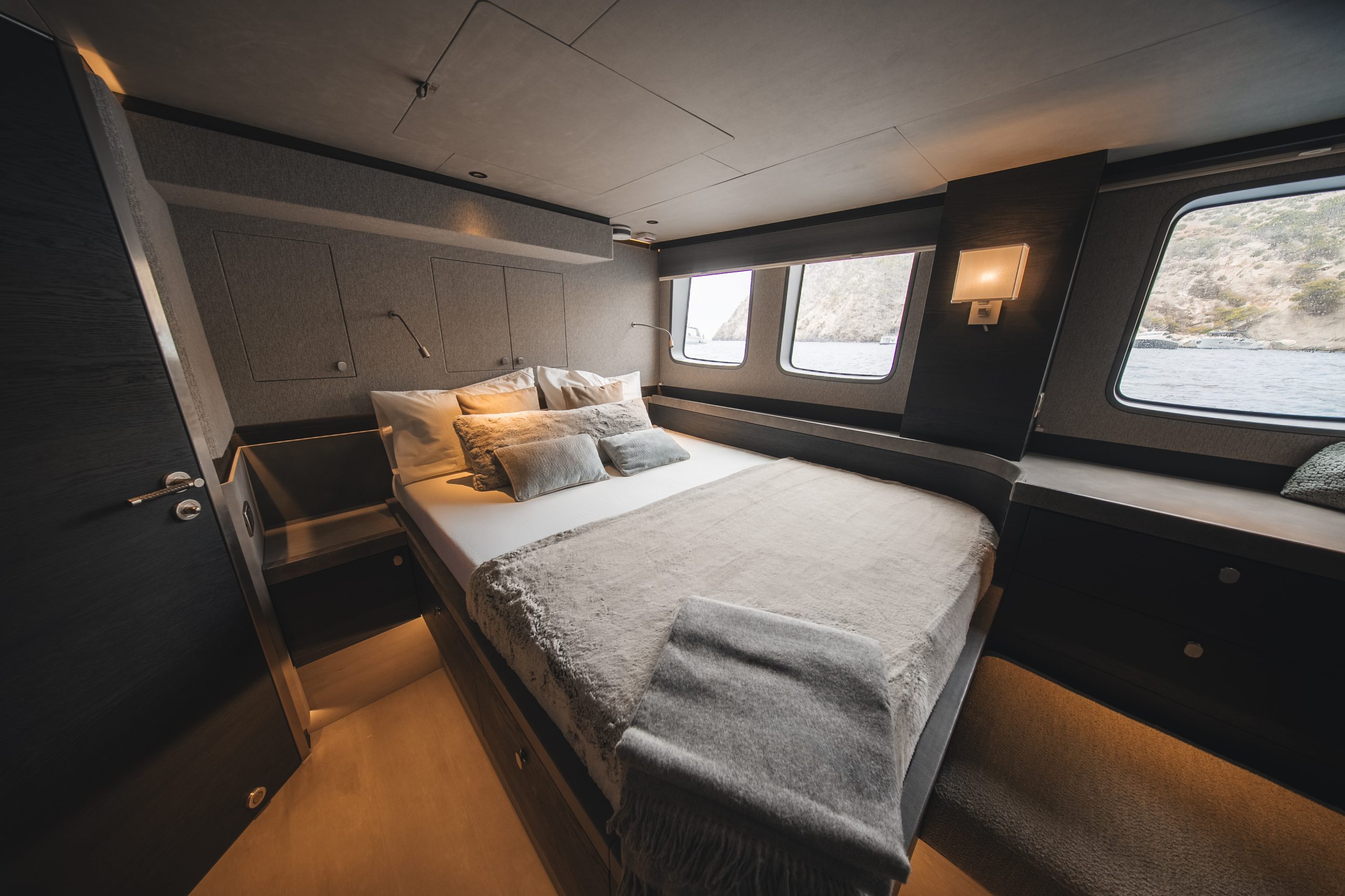 European-contemporary minimalism defines most of Loloma’s interior, with a measured stone, grey, sand and charcoal monochrome palette giving her a serene internal atmosphere that is both calmly uncluttered & texturally refined and textural. Brushed stainless steel finishes are another unique feature throughout Loloma, in place of the polished stainless steel more usually specified on Zeelander’s vessels. As a bold design first, the overall effects are truly outstanding. Along with the seamless Corian used to form her shower walls, elegant yet durable bouclé upholstery on her seating both inside & outside, and hand-painted grey wood art accenting her exterior, the clear result is one of ageless elegance enhanced with thorough attention to detail.