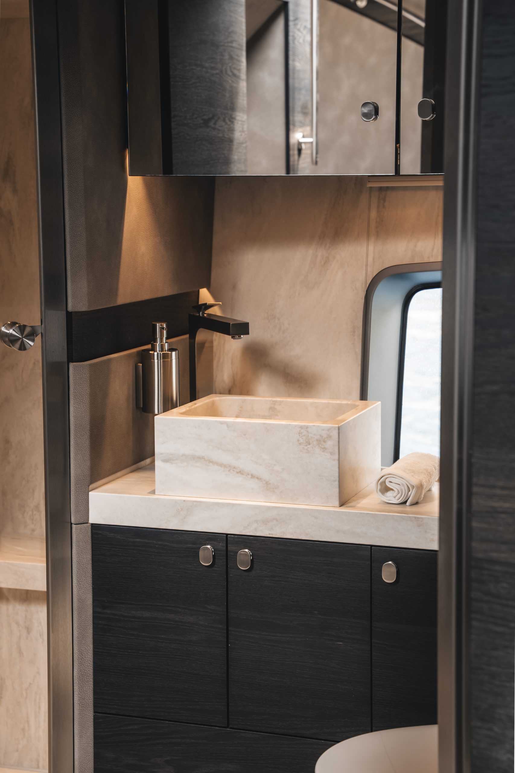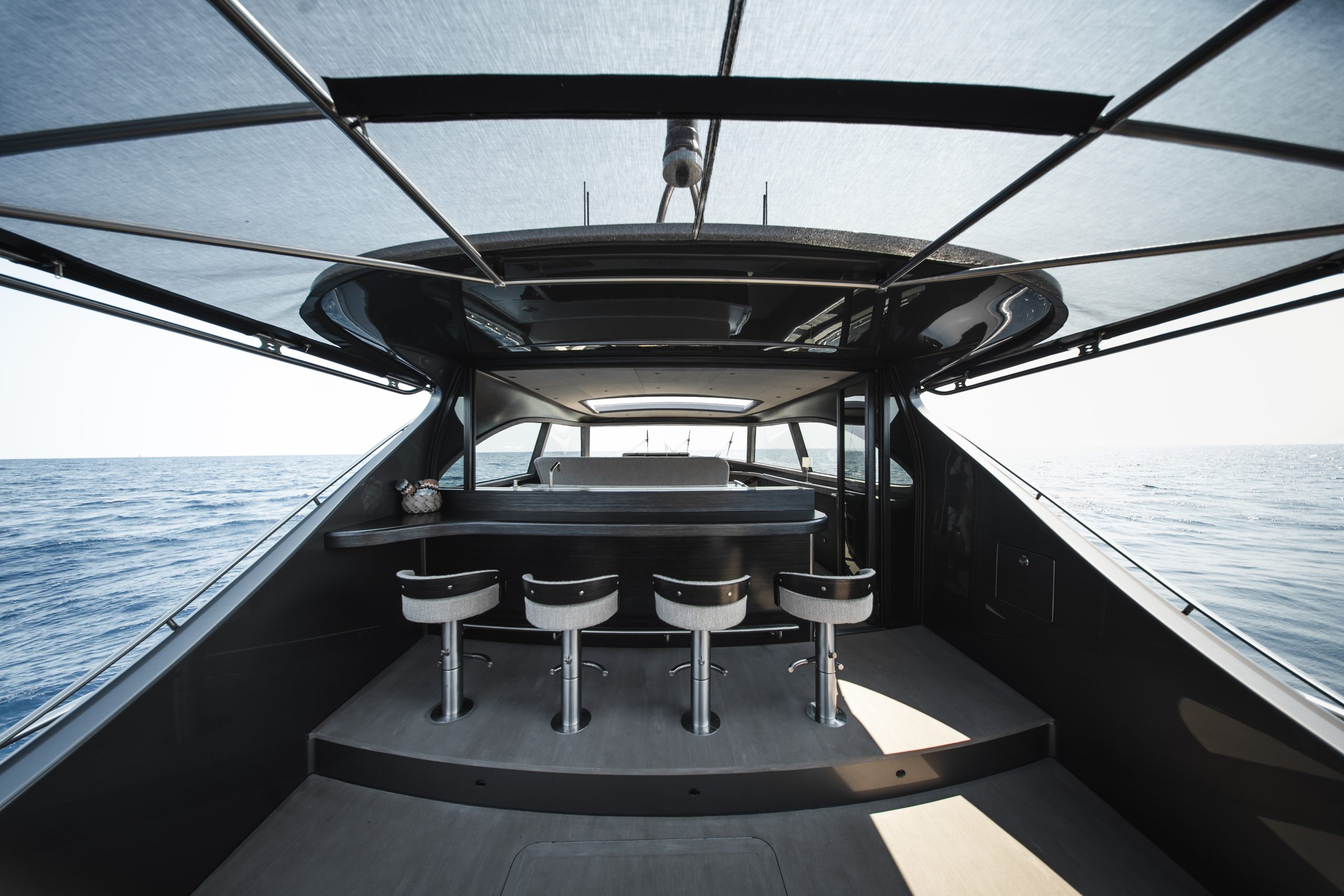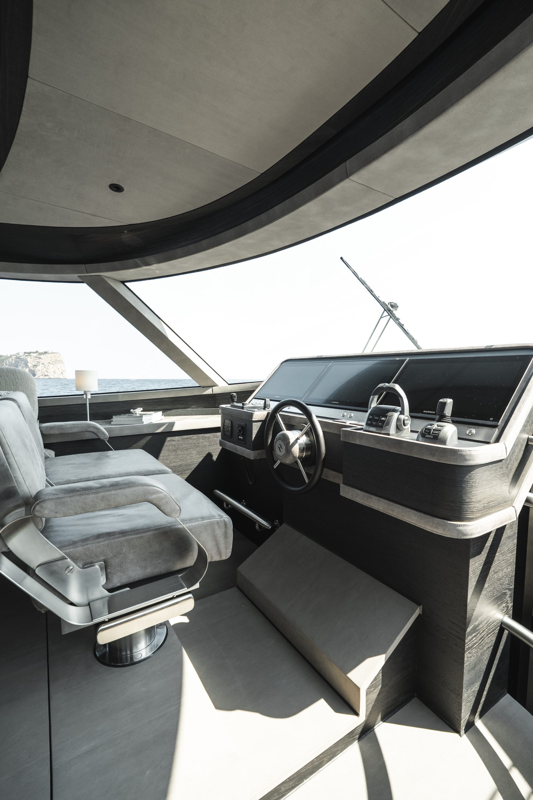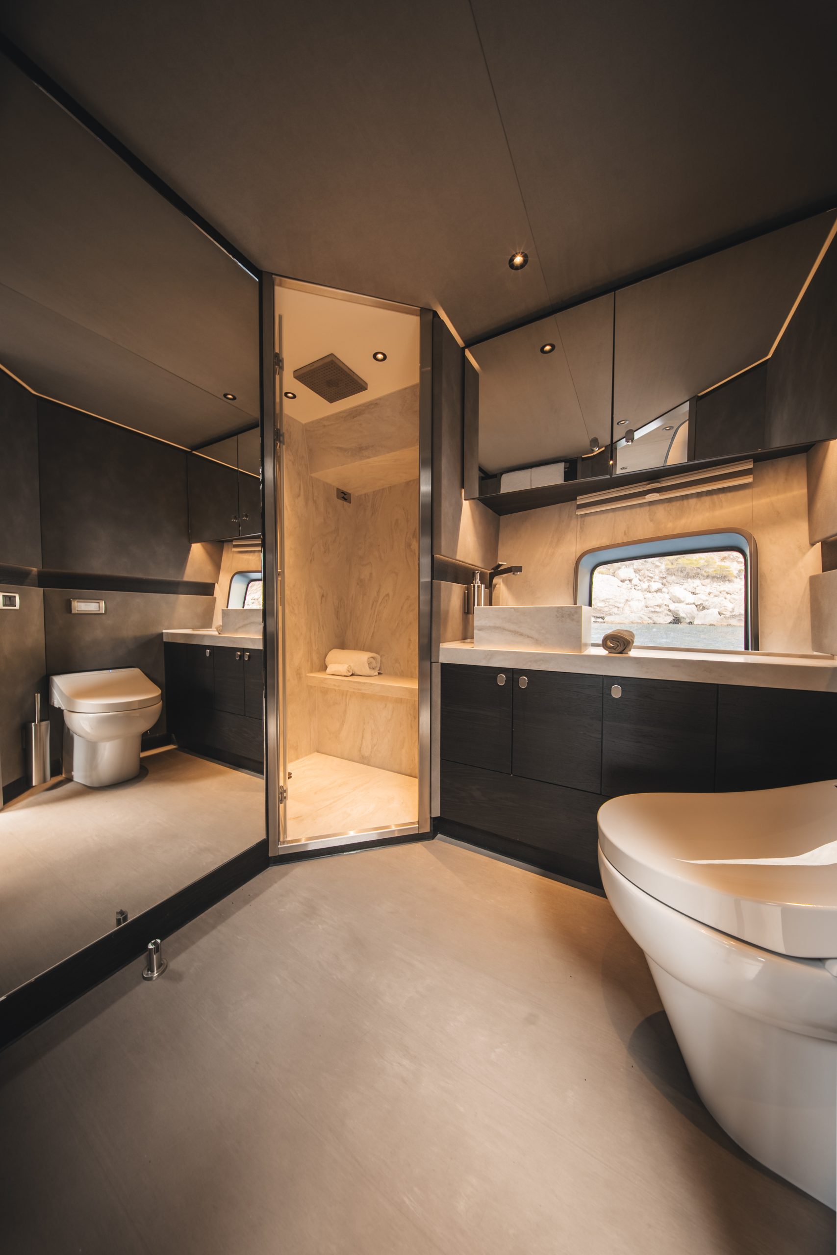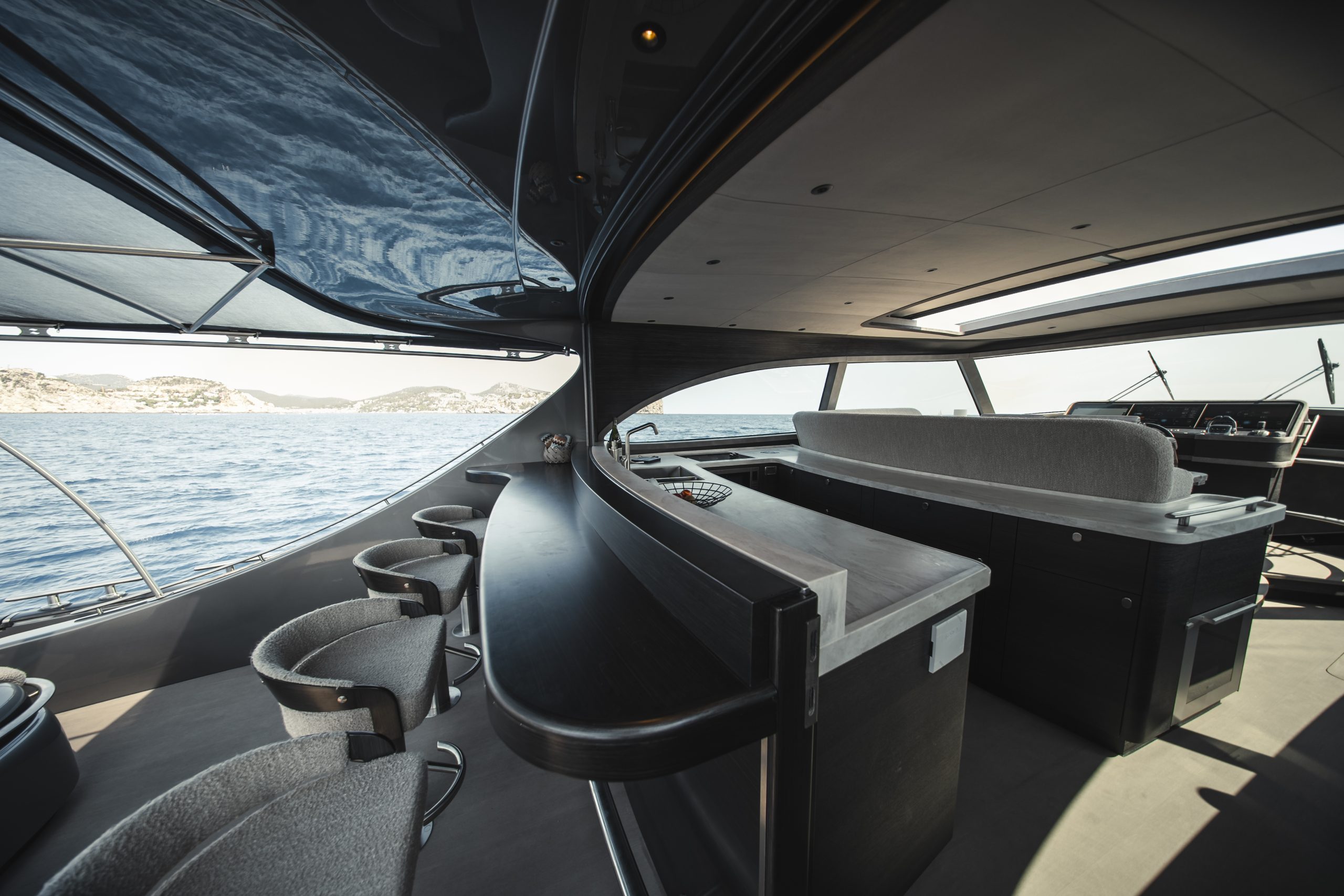 European-contemporary minimalism defines most of Loloma’s interior, with a measured stone, grey, sand and charcoal monochrome palette giving her a serene internal atmosphere that is both calmly uncluttered & texturally refined and textural. Brushed stainless steel finishes are another unique feature throughout Loloma, in place of the polished stainless steel more usually specified on Zeelander’s vessels. As a bold design first, the overall effects are truly outstanding. Along with the seamless Corian used to form her shower walls, elegant yet durable bouclé upholstery on her seating both inside & outside, and hand-painted grey wood art accenting her exterior, the clear result is one of ageless elegance enhanced with thorough attention to detail.