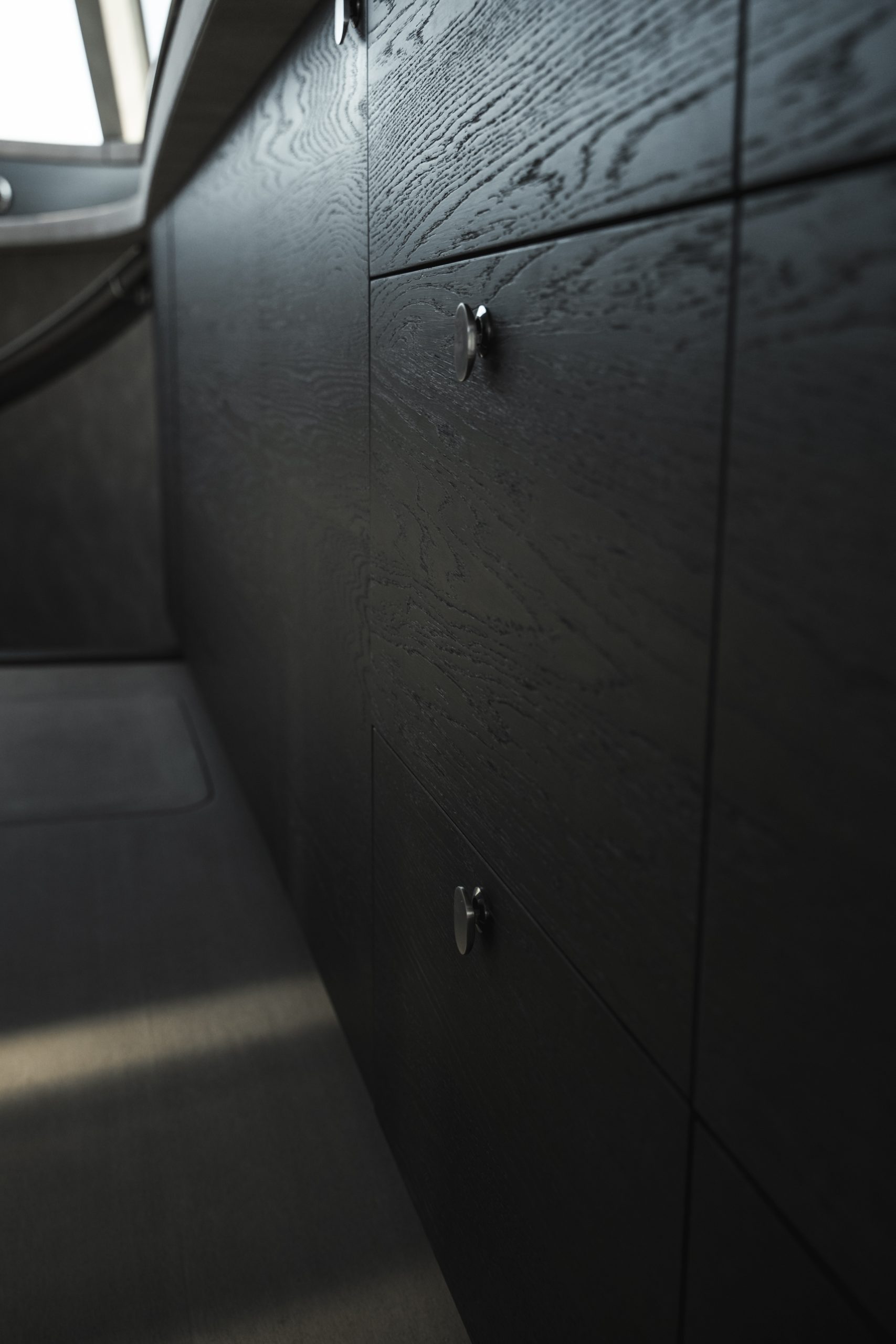 Moving inside, her interior also starkly contrasts existing styling traditions thanks to her owner’s bold design choices. For just one example, he elected to create a minimalistically modern look by using a single, large grey slab of synthetic teak without any seams. Meticulously crafted to match the aesthetics of her owner’s main superyacht, private jet and helicopter, ample swathes of striking swamp oak form another characteristic of Loloma’s interior. Formed when oak is submerged in peat bogs, swamps or riverbeds over a period ranging from hundreds to thousands of years — during which irons & tannins seep into the wood to grant it a richly dark colour somewhere between grey and black — this timber material can only be found through the course of natural discovery rather than grown, giving it a true nature of exclusivity.
