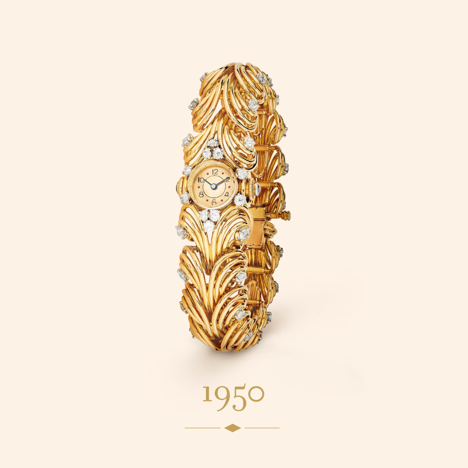 Then there is the bracelet watch created around 1950, a direct descendant of the couture-inspired Zip necklace from the mid-20th century. Fashioned from mirror-polished yellow gold, platinum, and diamonds, it shimmers with a liquid grace, demonstrating the fluidity of both precious metals and fine fabrics.