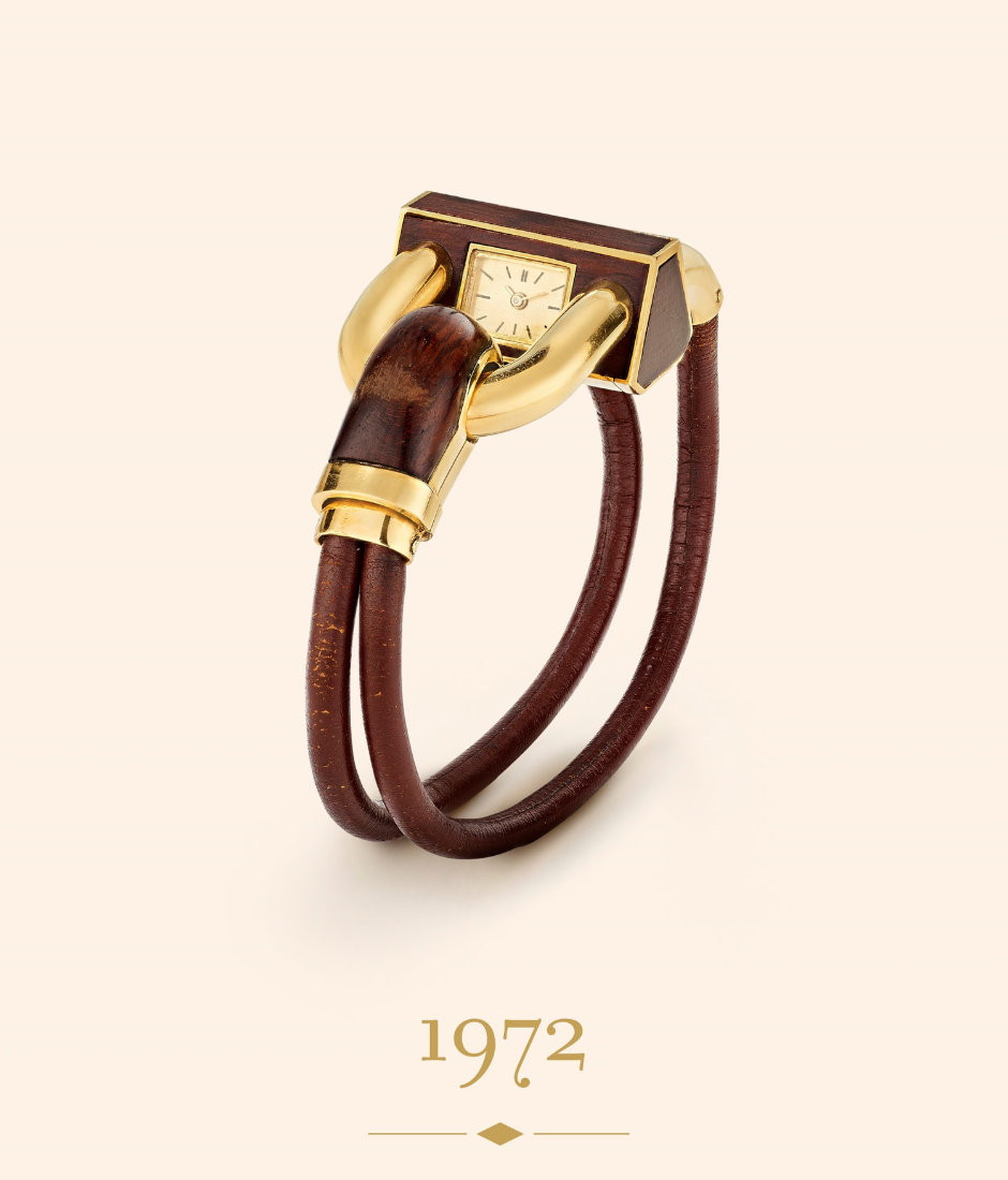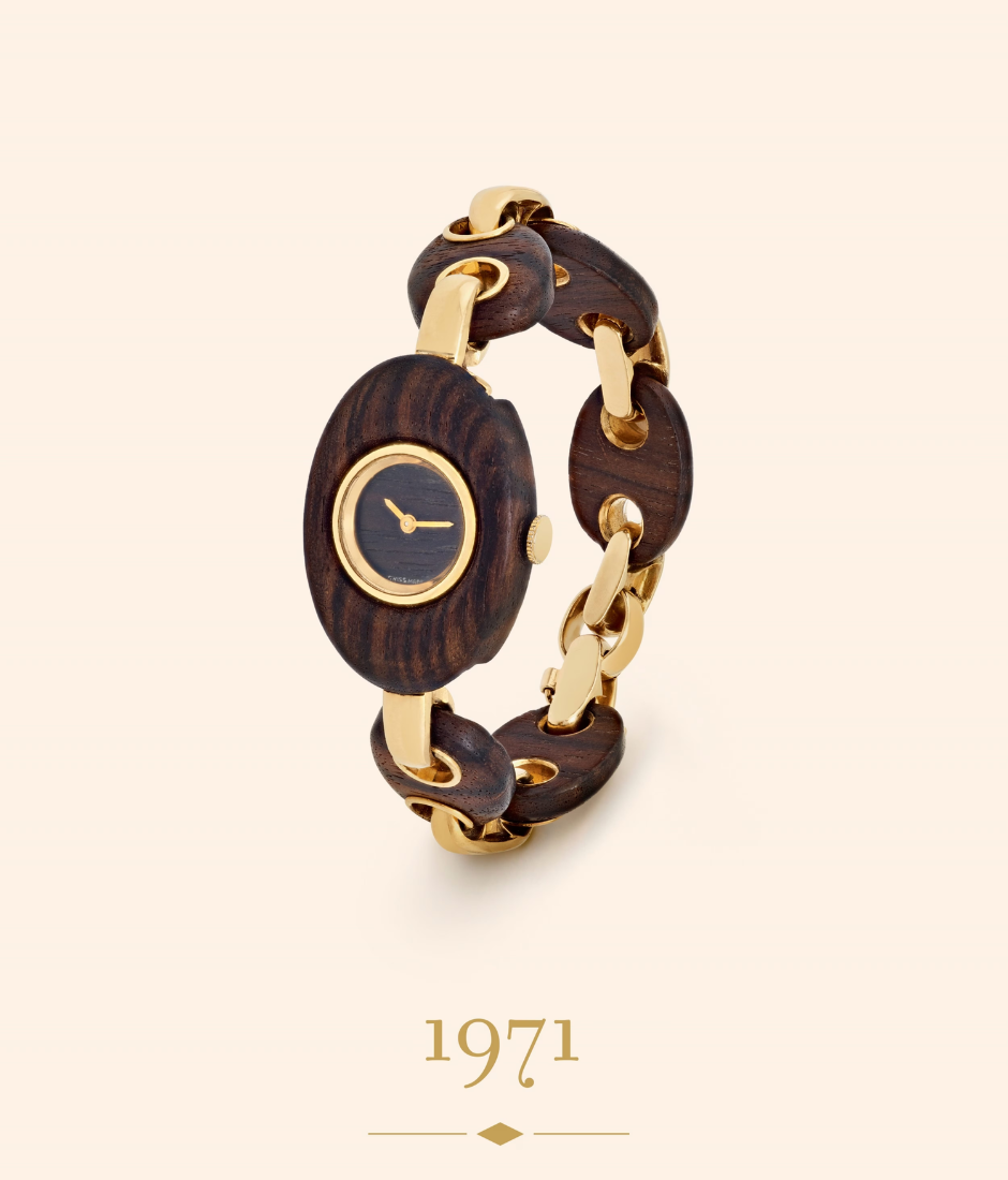 The Cadenas watch is a significant design in Van Cleef & Arpels’ history. Its debut in 1935 showcased the Maison’s embrace of the Modernist style through its geometric form. Initially made in yellow gold, the Cadenas evolved to feature a variety of colours and materials, including sapphires, rubies, and even wood. This last material, considered a lucky charm, gained considerable popularity over the years, enhancing various precious items. The 1970s saw a surge in the use of wood, leading to reinterpretations of some of the Maison’s most iconic pieces. The bracelet of the 1972 Cadenas watch exemplifies the design trends of that era.