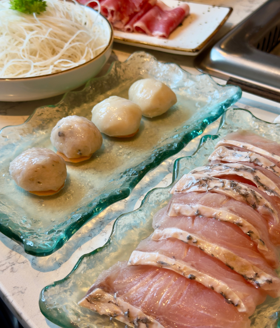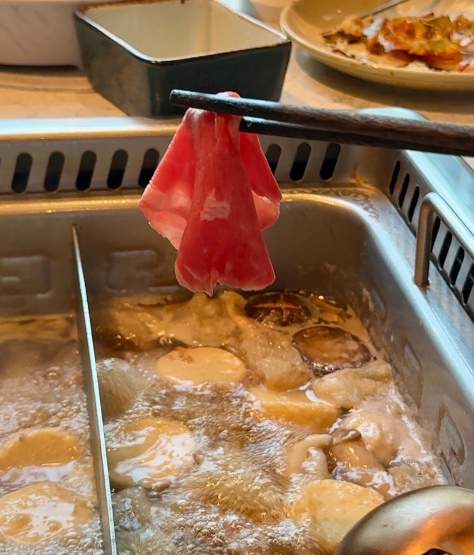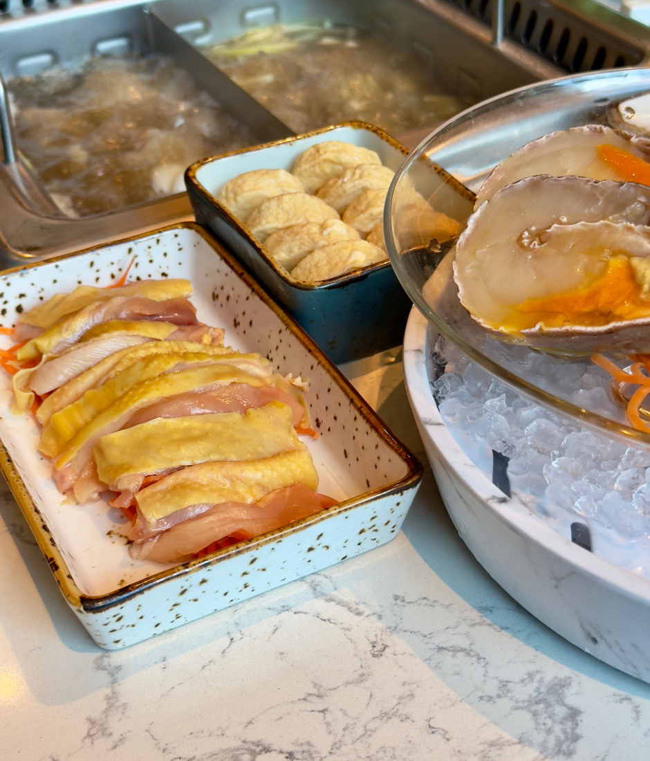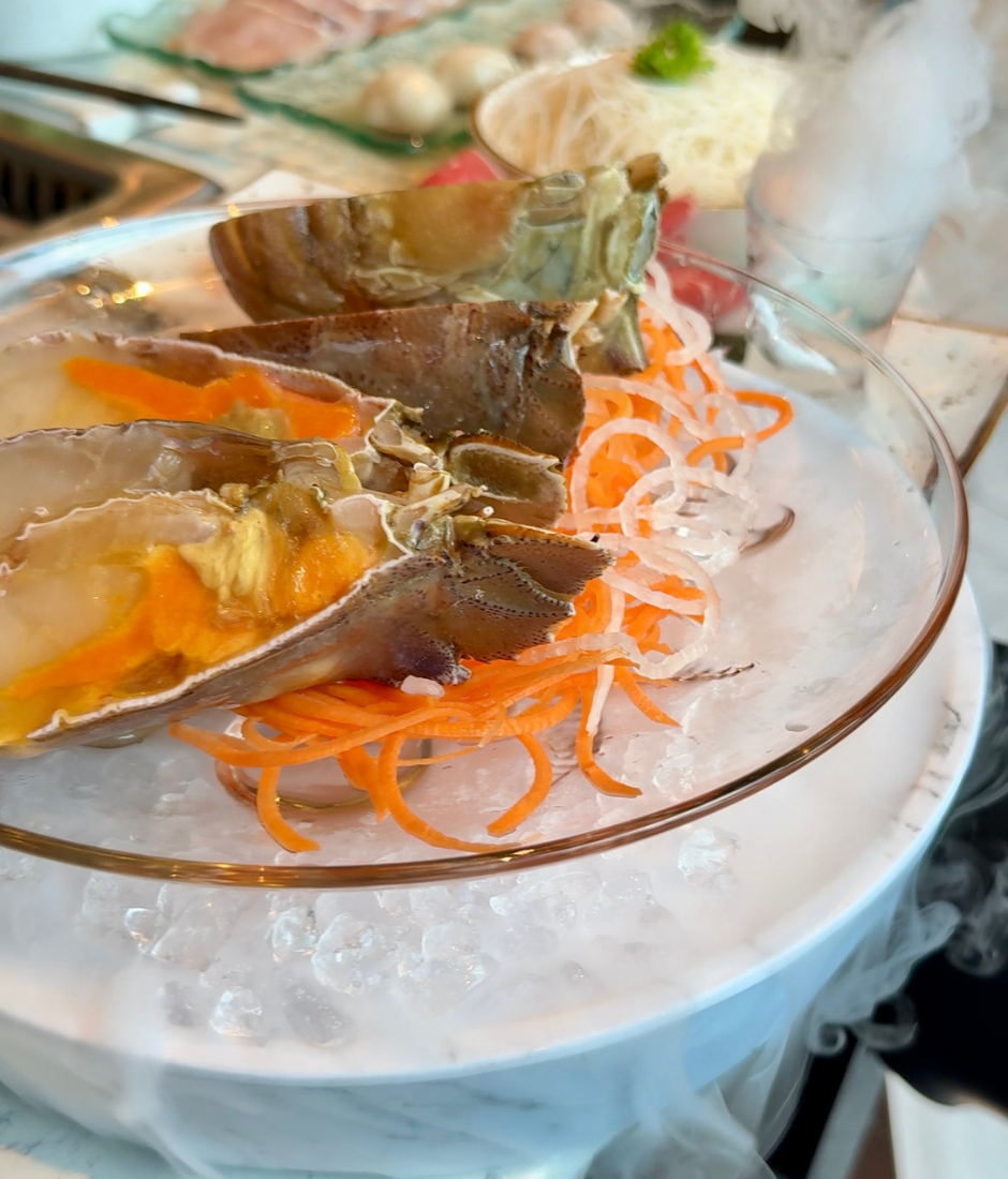 The meal we had kicked off with the signature dual, or yin-yang, pot, which gives you two equally soothing flavours: the earthy truffle mushroom soup and the comforting, mild coconut chicken broth. The set is loaded with premium ingredients — a great mix of seafood, quality meats, and seasonal veggies. One of the highlights of the set is the slipper lobster; its firm, bouncy flesh is so fresh, it practically tastes like it just jumped out of the ocean! You also get juicy slices of beef (or lamb, if you prefer) alongside all the perfect mushrooms and greens. Cook it all up, dip it in your custom sauce, and this hot pot will definitely leave you begging for seconds.